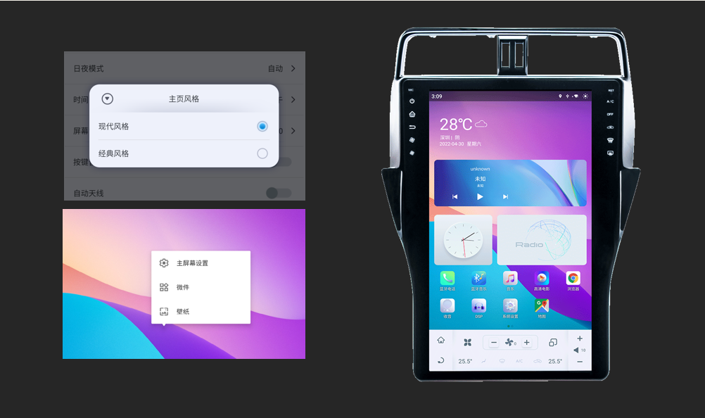 我的車(chē)機(jī),我做主! G6系列人性化設(shè)置了現(xiàn)代風(fēng)格/經(jīng)典風(fēng)格兩種主題供使用者選擇,現(xiàn)代風(fēng)格為安卓平板模式,經(jīng)典風(fēng)格為車(chē)載專(zhuān)用導(dǎo)航模式。現(xiàn)代風(fēng)格主題下,使用者可以根據(jù)自己的愛(ài)好,對(duì)主界面進(jìn)行個(gè)性化的設(shè)定,包括功能圖標(biāo)的排列,微件,壁紙等元素的設(shè)定。